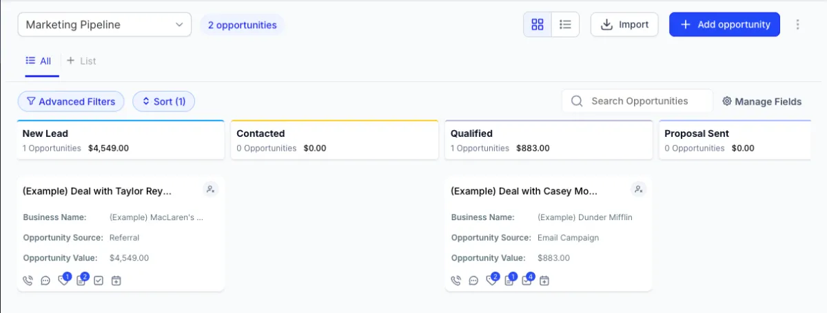 Oportunidades y Pipelines: Cada prospecto se organiza en un sistema visual tipo tablero, donde puedes ver en qué etapa está, qué necesita y cómo convertirlo en cliente. Nunca más perderás una oportunidad por desorganización.